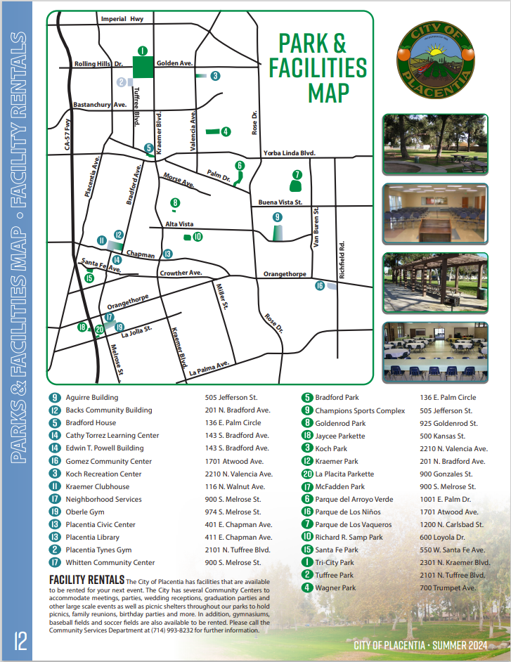 The City of Placentia Community Services Department has facilities available to rent for your next event. These facilities are perfect for all events including picnics, meetings, receptions, birthday and graduation parties, and other special events.